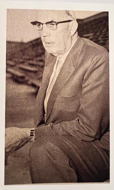 History Professor Raymond James Sontag, a student favorite, with a bench honoring him to the right of Sather Gate